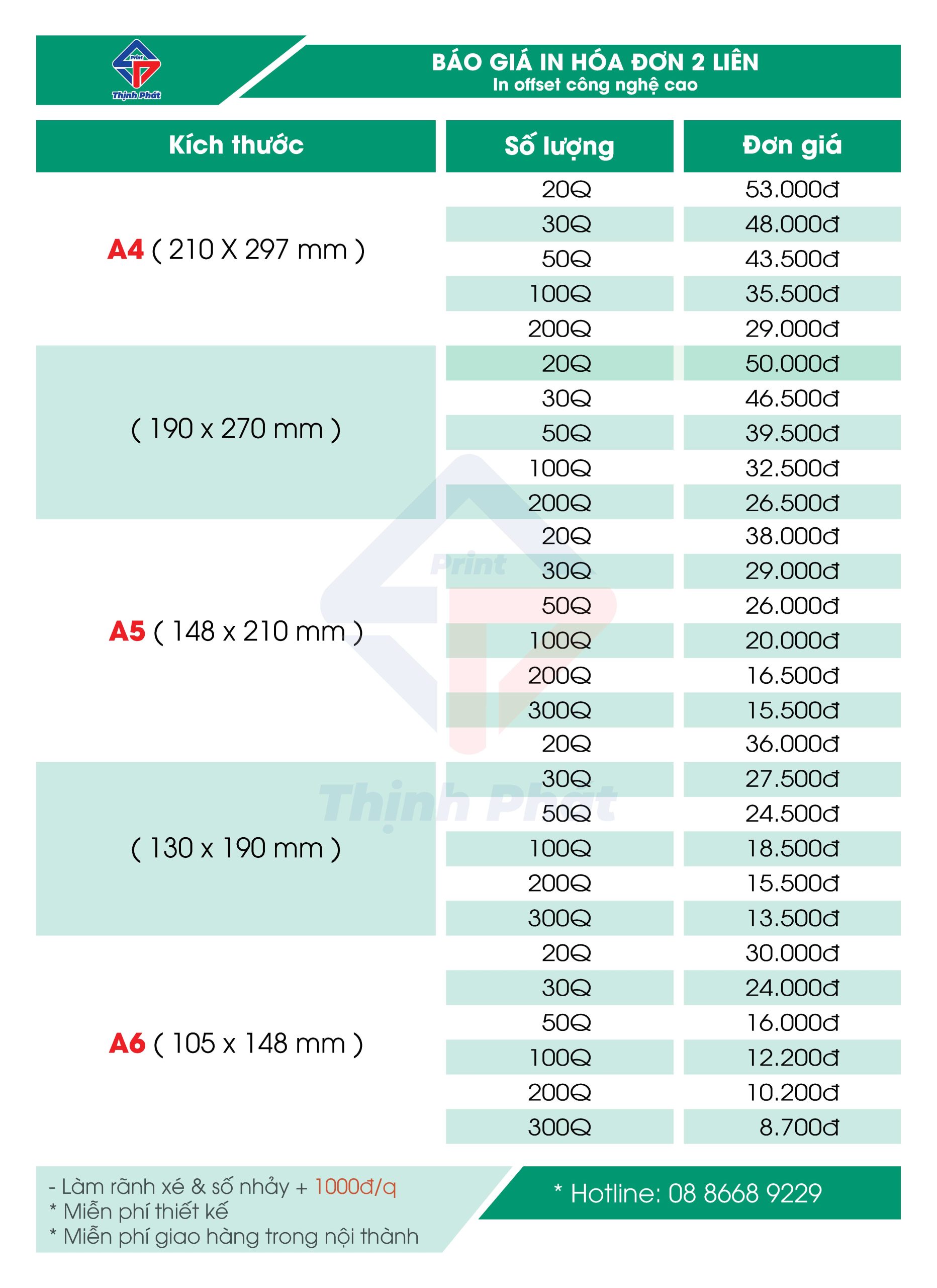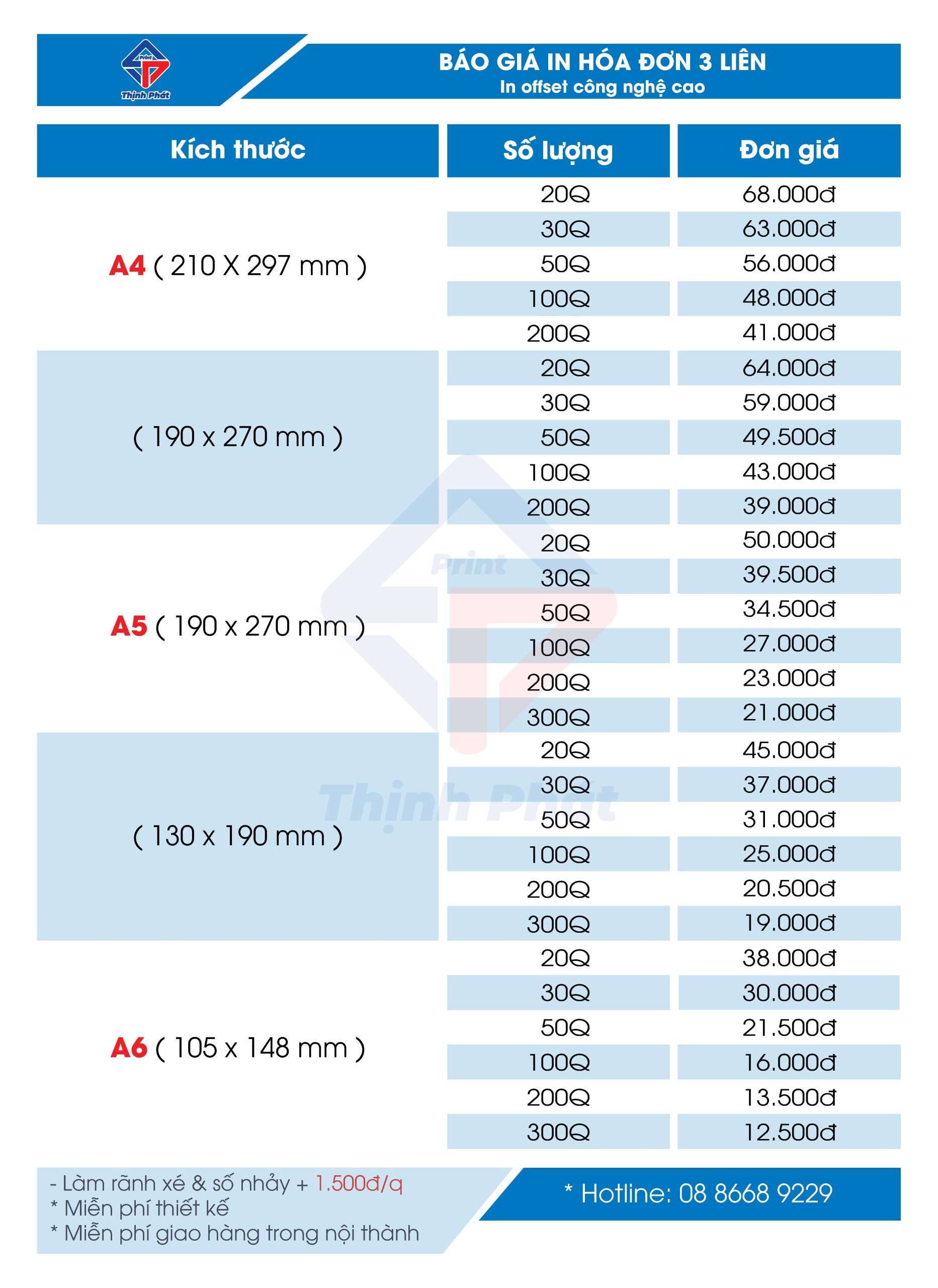 Dịch vụ in hóa đơn chuẩn chỉ – đúng quy định – rõ ràng từng liên. In Thịnh Phát cam kết chất lượng giấy tốt, mực bền, số nhảy chính xác. Báo giá chi tiết theo số liên, quy cách đóng cuốn và số lượng đặt in, hỗ trợ giao hàng nhanh toàn quốc.