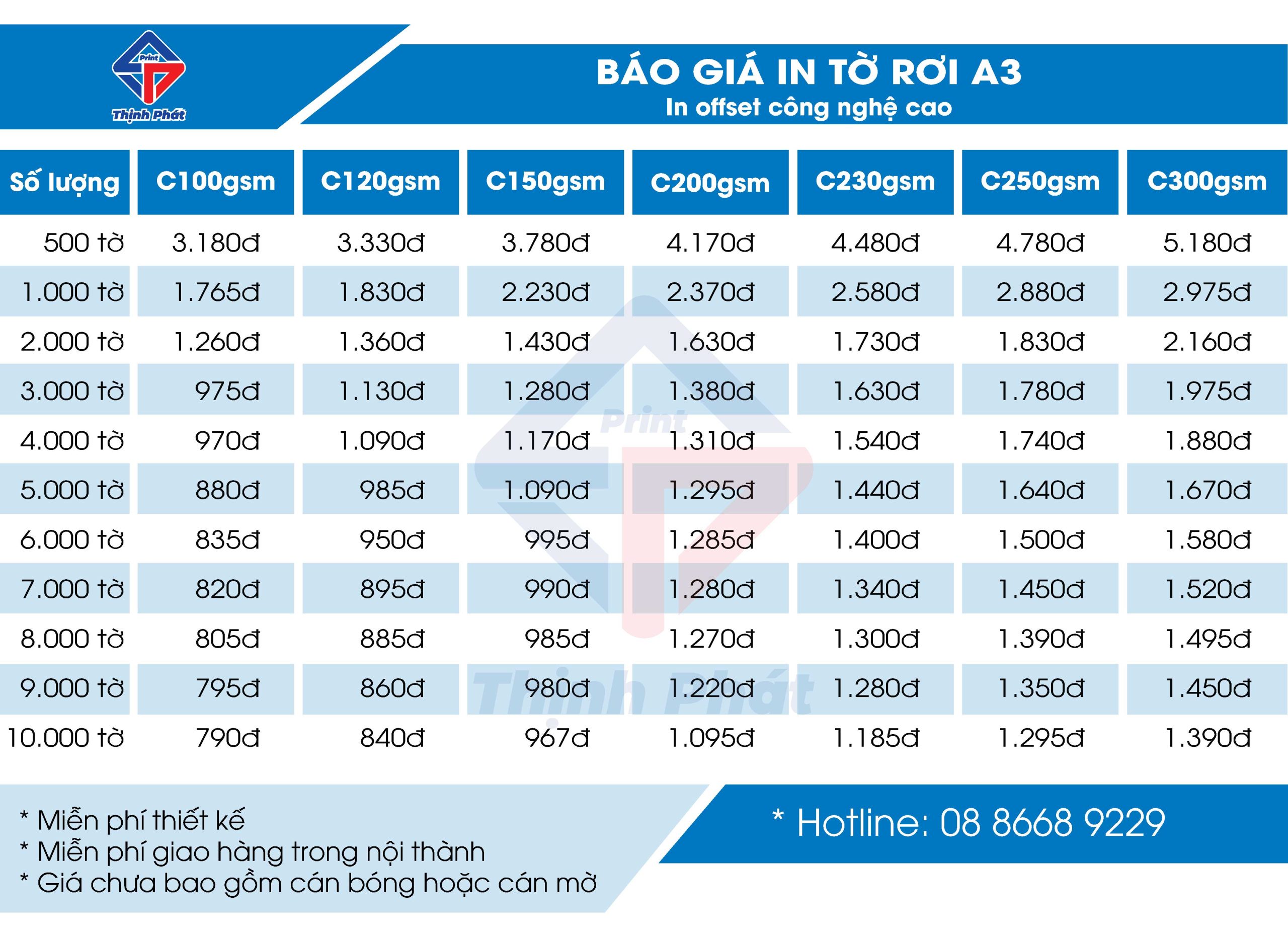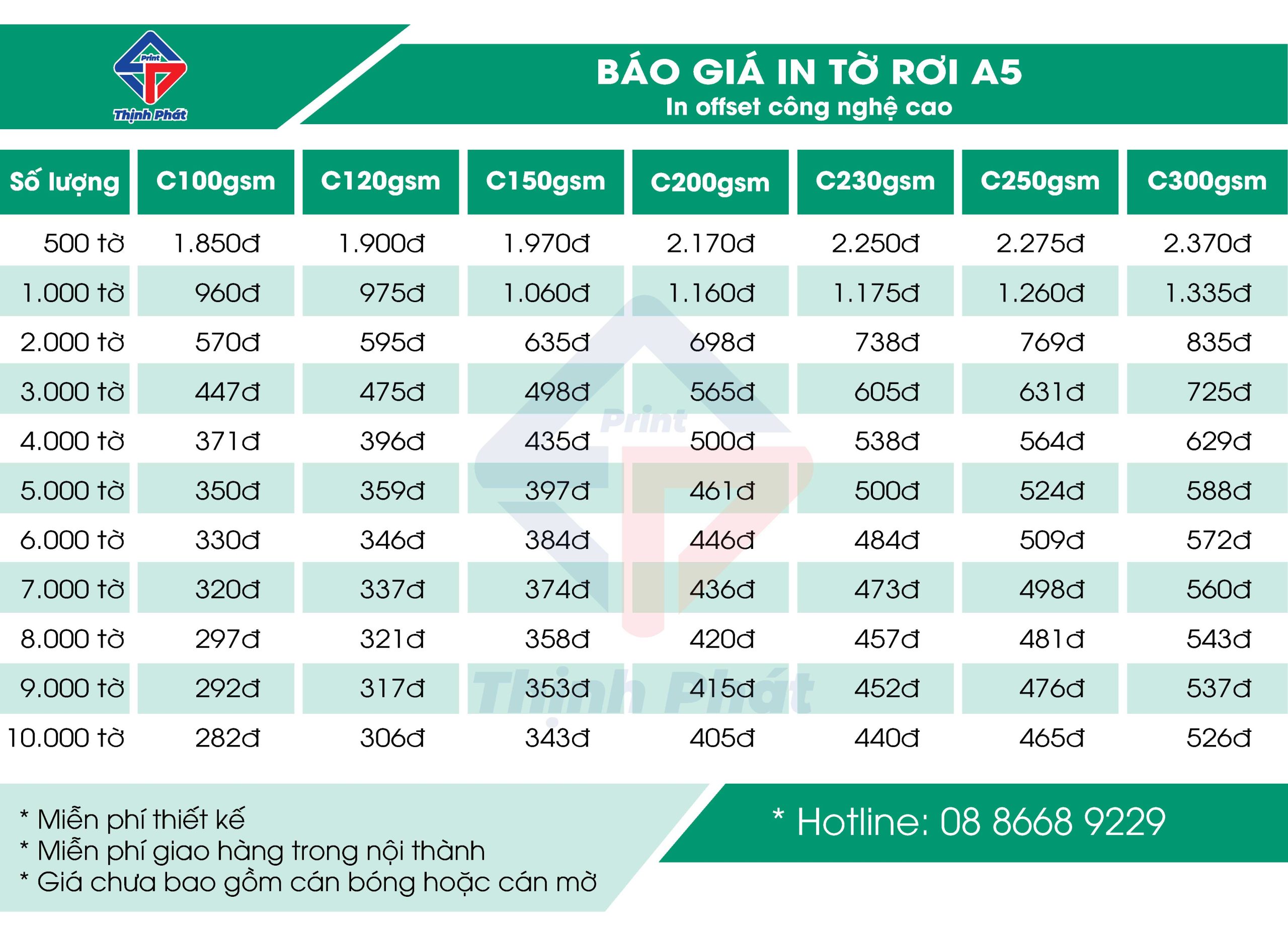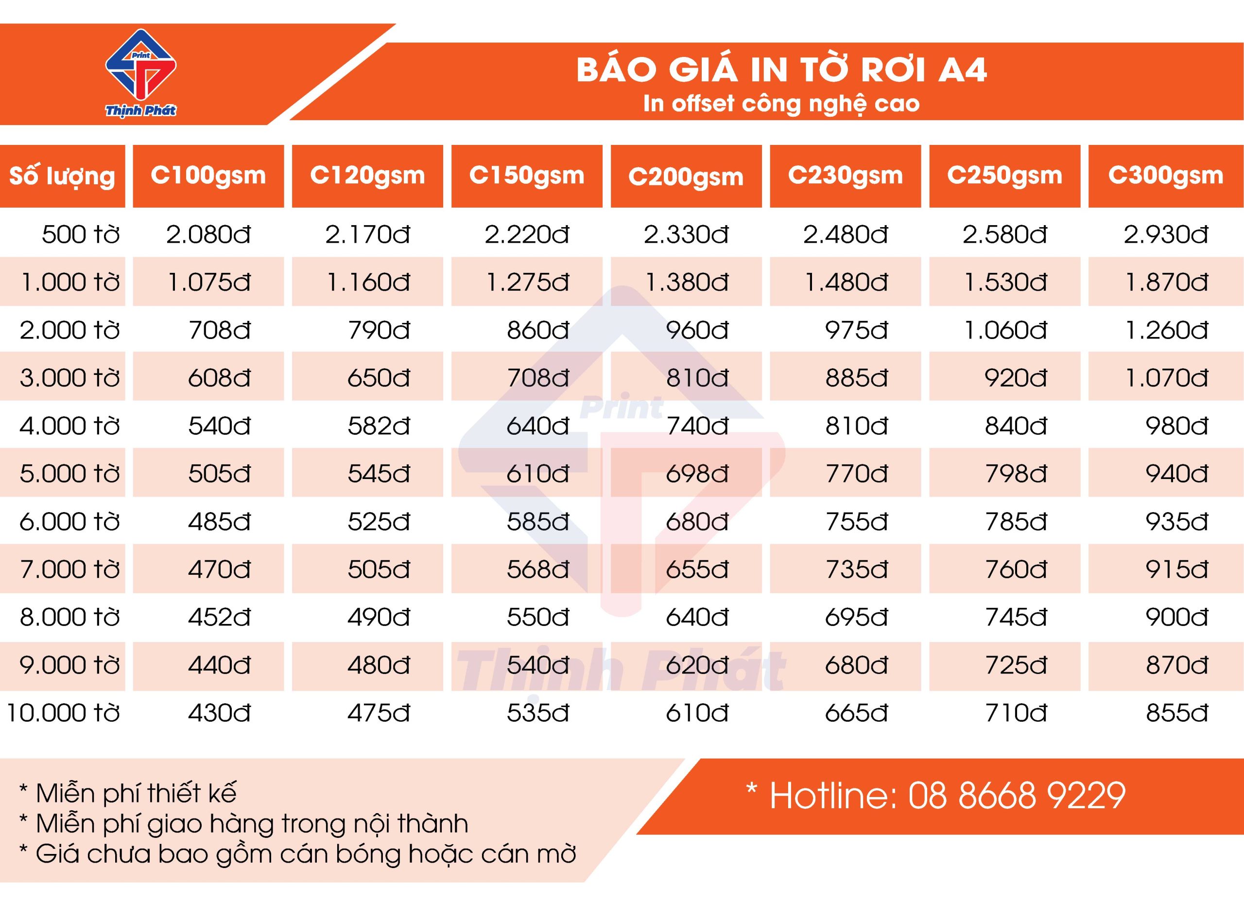 Dịch vụ in tờ rơi tại In Thịnh Phát nổi bật với chất lượng in rõ nét, màu sắc bắt mắt, phù hợp cho các chiến dịch quảng bá sản phẩm và sự kiện. Báo giá linh hoạt theo kích thước, chất liệu giấy và số lượng in, hỗ trợ thiết kế miễn phí cơ bản.